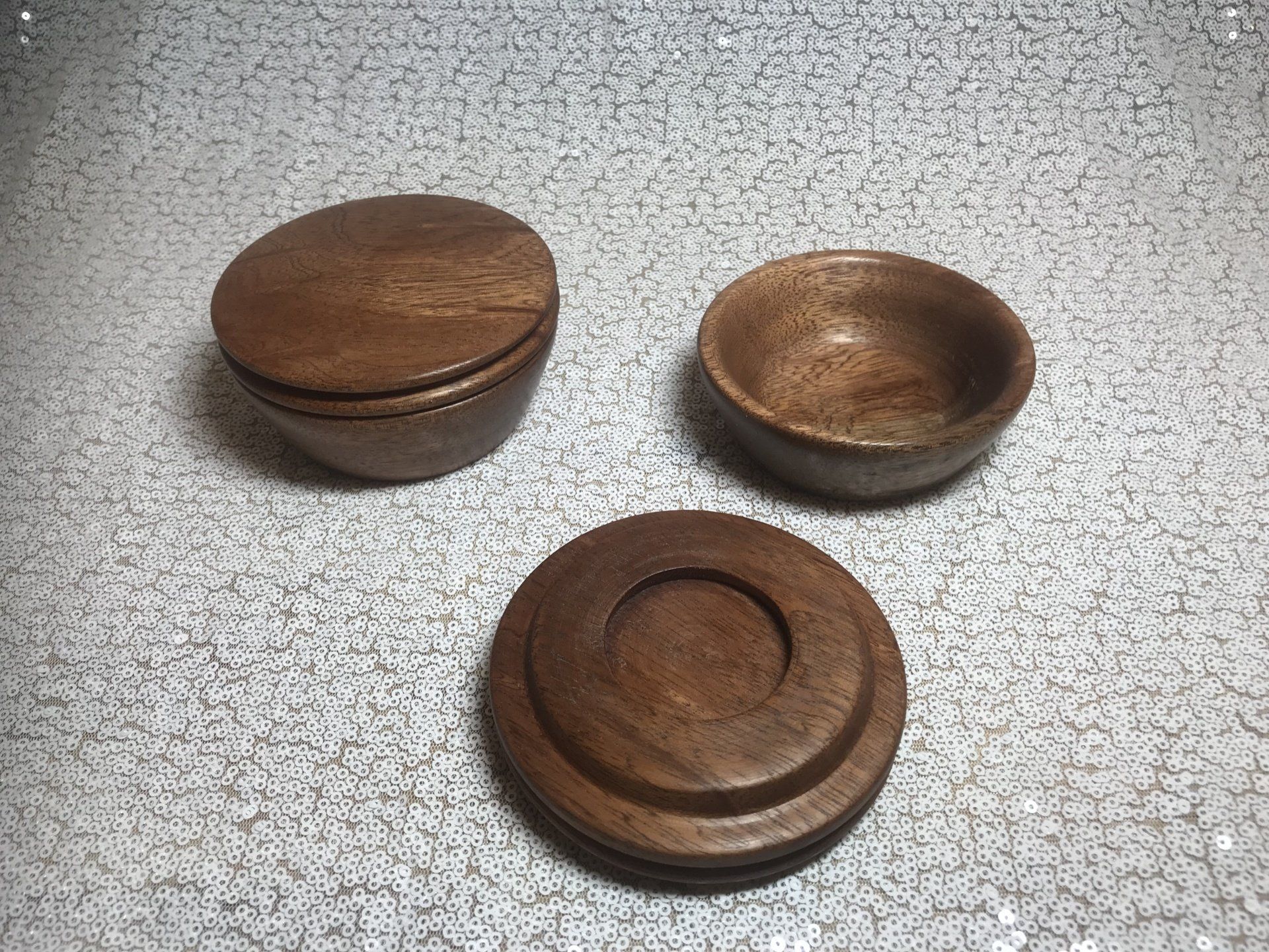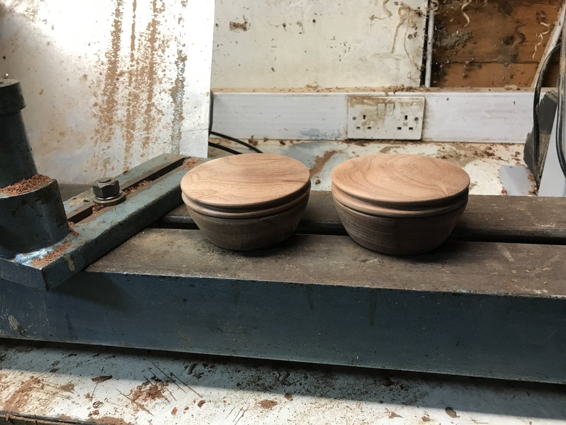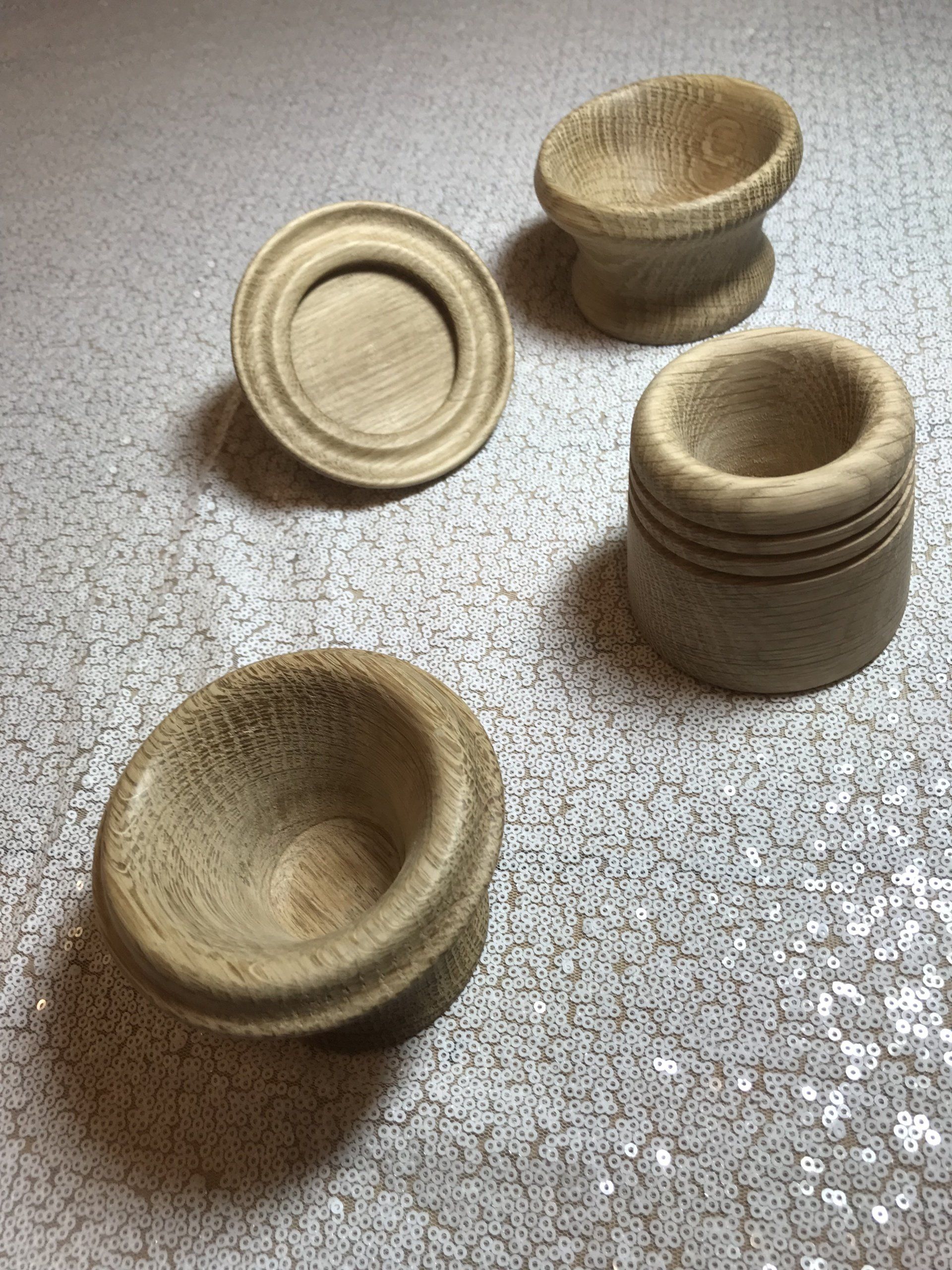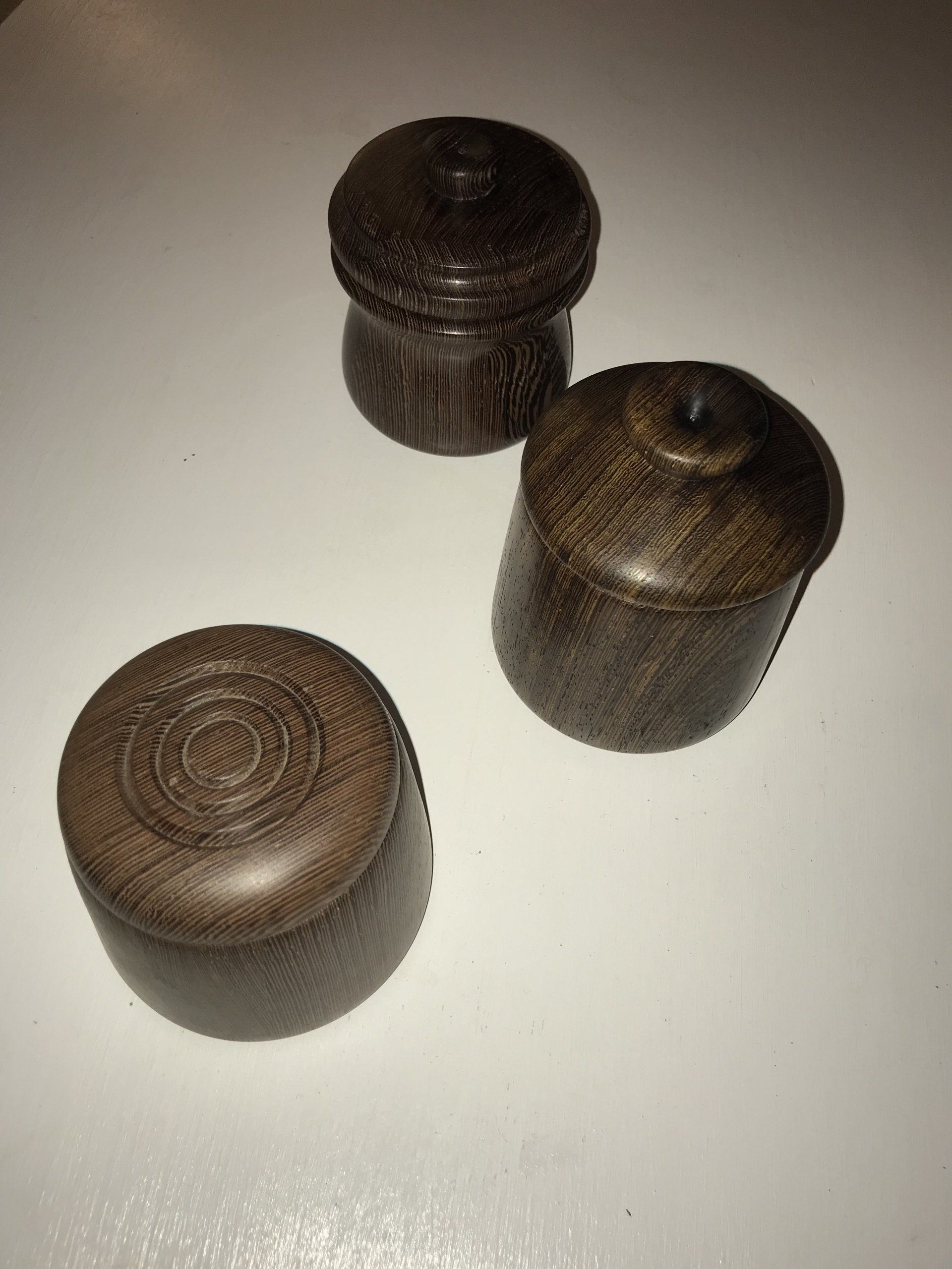 A selection of handmade Wenge and Oak wooden pots. All designed and crafted by Neil Costen. Can be Polished in Wax or Natural Oils.