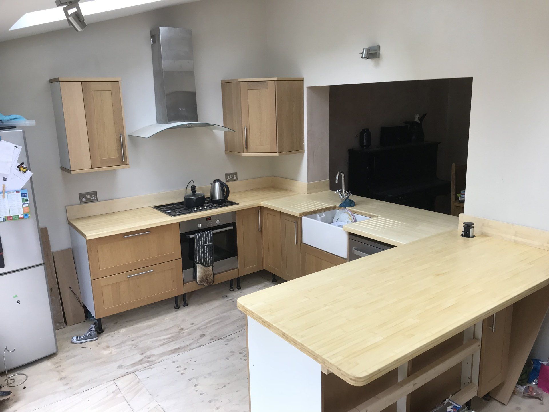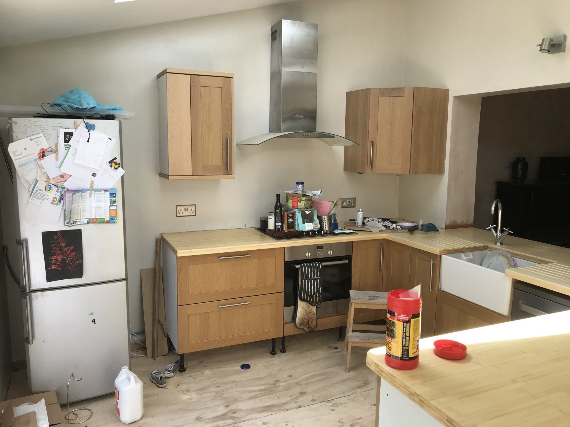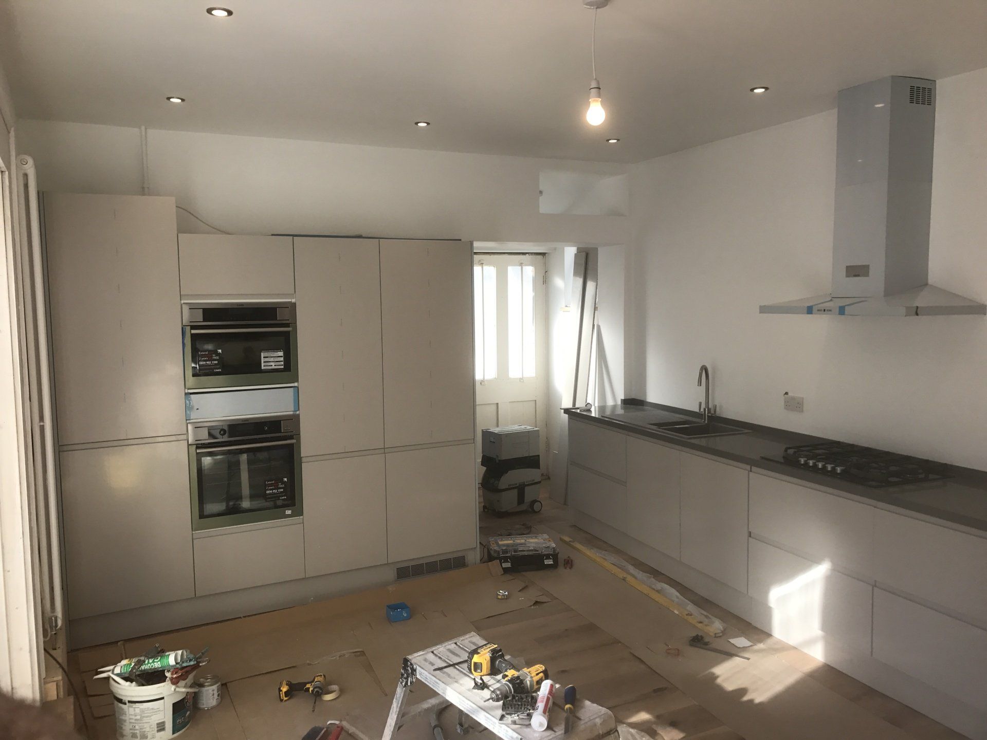 Below a modern kitchen installation after completing all the building work of wall removals, new steels, plastering and plumbing/electrical. Also a kitchen going into a newly made extension I had been working on.